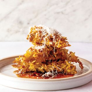 Potato Pancakes, Poached Eggs, and Green Onion Sauce