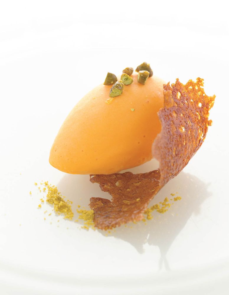 Apricot Sorbet with Vanilla Sablée, Candied Sicilian Pistachios, Apricot Paper, and Pistachio Dust