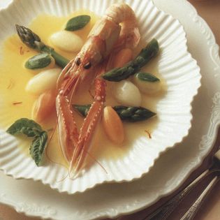 A Light Stew of Dublin Bay Prawns and Asparagus in a Saffron Soup
