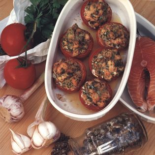 Baked Tomatoes Stuffed with Salmon, Garlic, and Capers