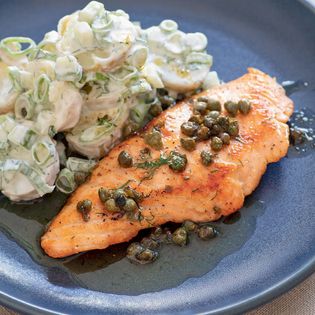 Seared Escalope of Salmon with a Potato & Spring Onion Salad, Capers & Brown Butter