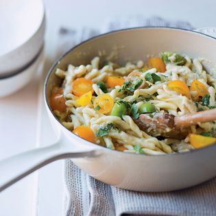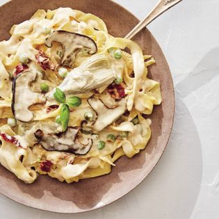 Linguine Carbonara with Peas, Artichokes, and Shiitake Bacon
