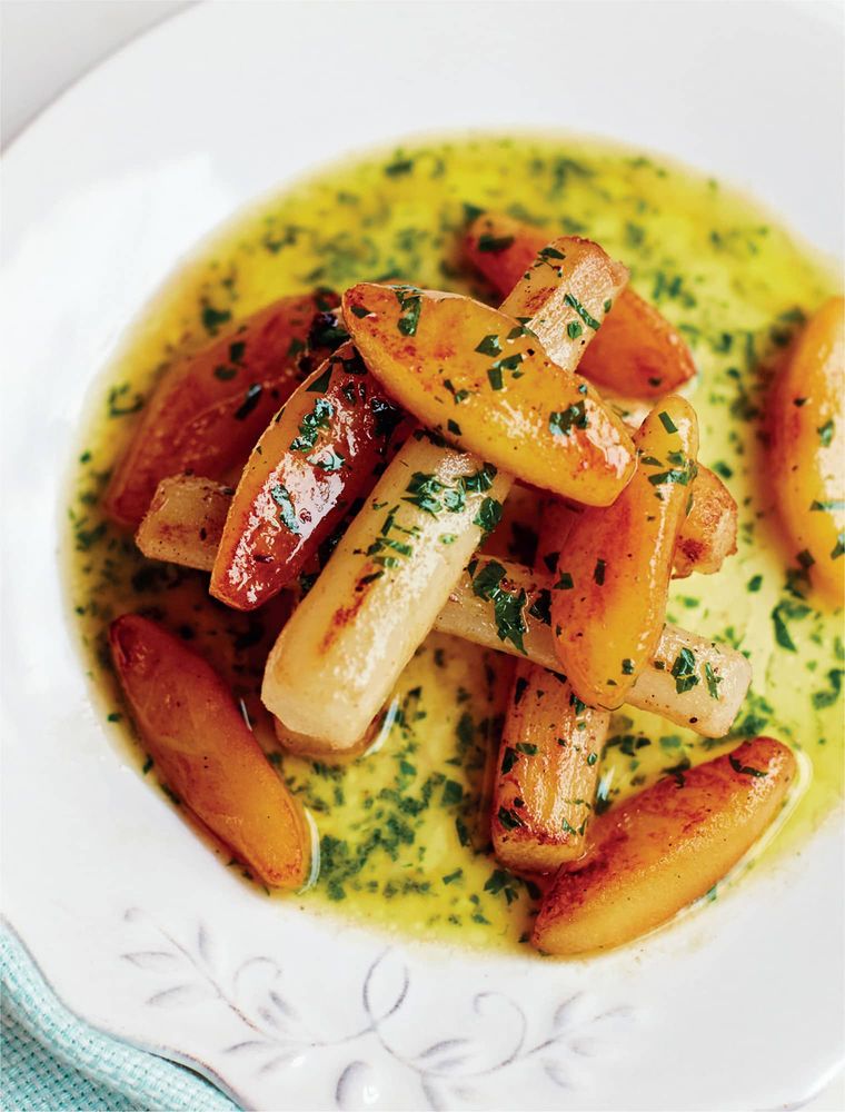 Salsify, a winter root with a delicate, creamy texture, shines in both crisp and tender dishes. It is sometimes called the "oyster plant" for its subtle, slightly briny flavor. Try Salsify Fritters for a golden, crunchy treat or Salsify with Cider and Ham Hock for a rich, savory dish. It also adds depth to a Salad of Sprout Tops, Salsify and Ham Hock. Gently poach or steam before finishing with butter, herbs or a light sauce.