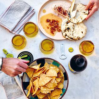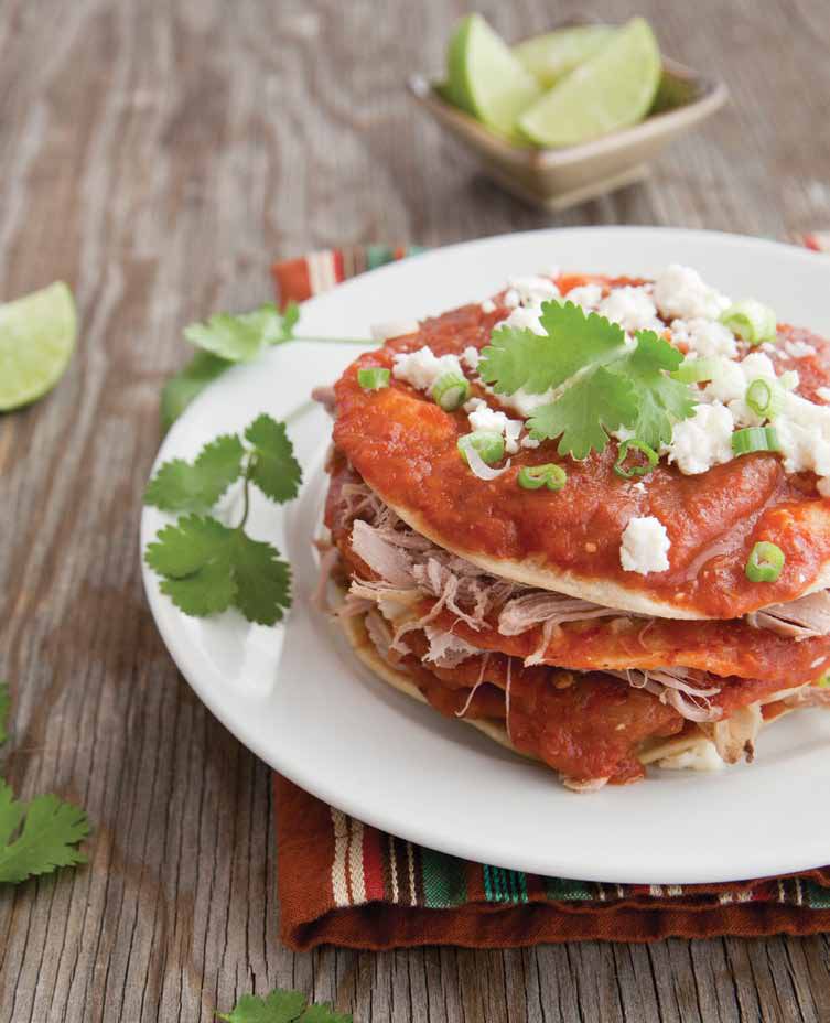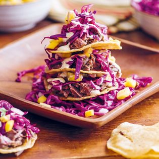 Braised Pork Cheek Tostada Stacks with Chipotle Sour Cream and Pineapple-Mango Salsa