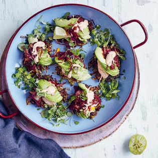 Courgette & Pepper Rostis with Chipotle Mayo, Avocado & Caramelised Onions