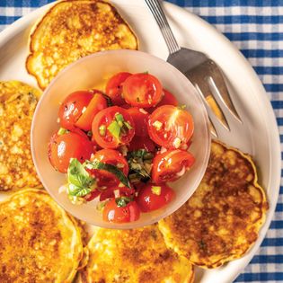 Roasted Corn Pancakes with Cherry Tomato Salsa and Goat Cheese