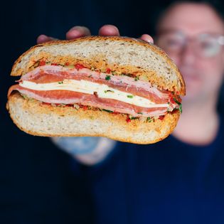 Smoked Salmon, Salami, and Mortadella Muffuletta Sandwich with Pickled Pepper Tapenade