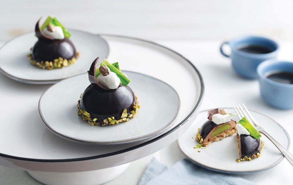 Mini cakes make a great choice for weddings, too. Ann Reardon’s Chocolate Pistachio Domes would be one elegant possibility. For a large celebration, individual cakes can be a lot of work, requiring careful attention not only to the cakes themselves, but also to details such as ribbon bows and packaging. But it is worth it in the end, as each guest receives a delicate, beautiful, and flavor-filled treat.