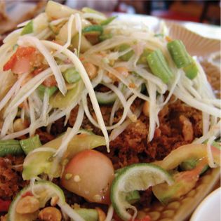 Green Papaya Salad with Long Bean, Limes, Roasted Peanuts and Sticky Rice
