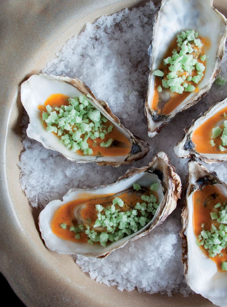 Poached-Oysters, Chorizo-Cream, Cucumber-Granita