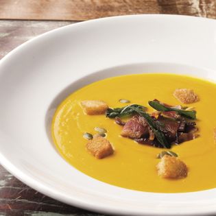Butternut Squash Soup with Apple-Bacon Relish and Toasted Butternut Squash Seeds