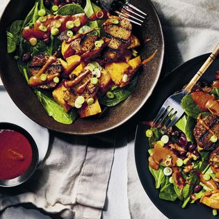 Pantry Mole Bowl with Seitan, Spinach Salad, and Sweet Potatoes