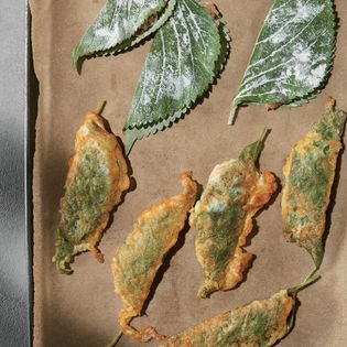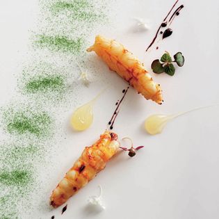Charcoal-Grilled New Zealand Scampi with Sudachi, Shiso and Blood Orange Caramel, and Mitsuba