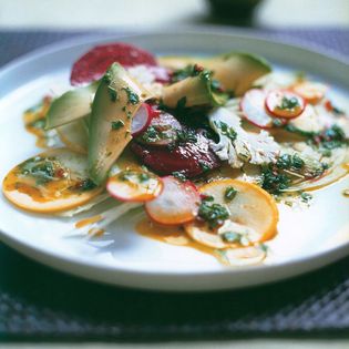 Vegetable carpaccio with saffron verde dressing - RAW