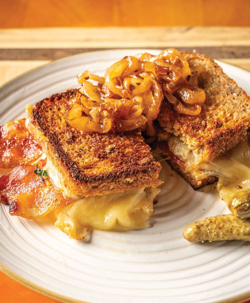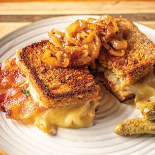 Grilled Swiss Cheese and Bacon Sandwich with Beer-Glazed Onions