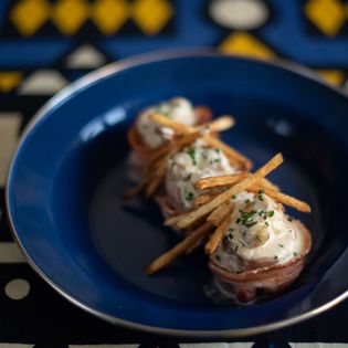 Bacon-Wrapped Sole Paupiettes, Seared Scallops & Matchstick Potatoes
