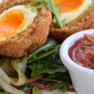 Whitby Kipper ‘Yorkshire Eggs’ with Pickled Cucumber and Rhubarb Relish