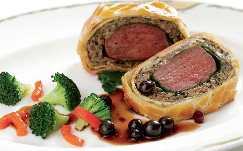 Roasted Loin of Venison in a Pastry Crust with Wild Mushrooms, Garnished with Florets of Broccoli, Hermitage Wine Sauce with Blackcurrant Vinegar