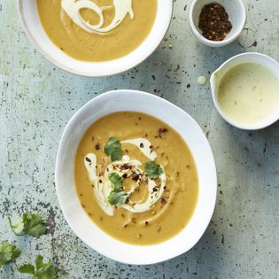 Butternut squash and sweet potato soup with roasted pumpkin seeds