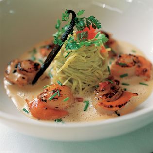 Lemon and basil linguine with flash-fried scallops and vanilla froth
