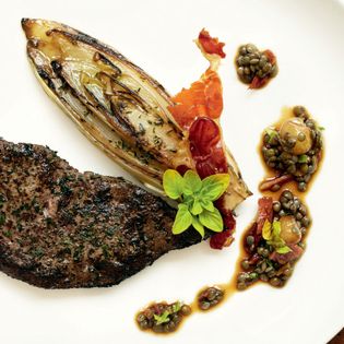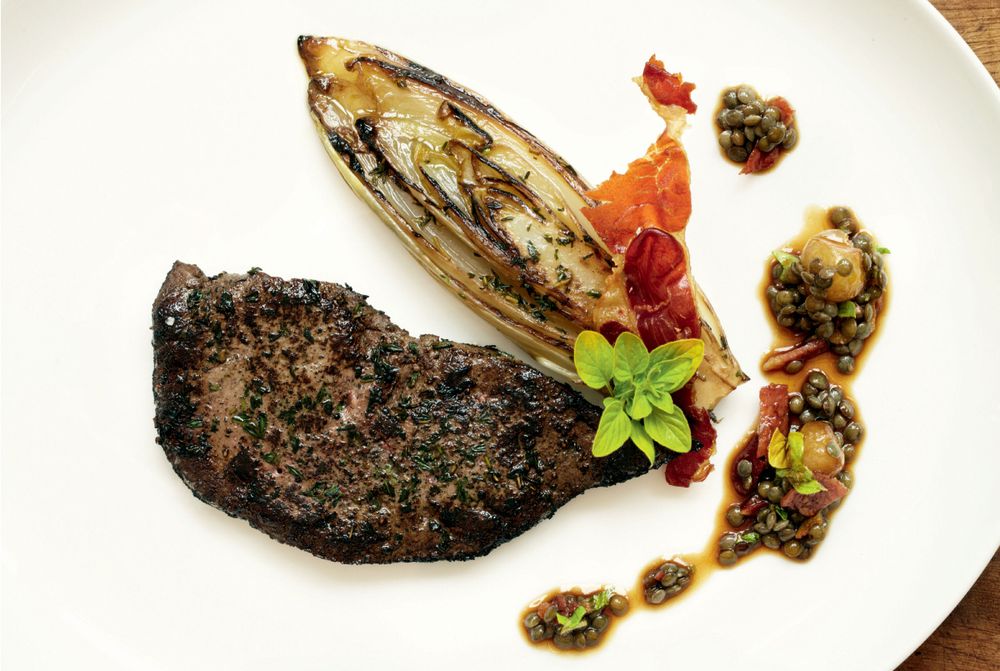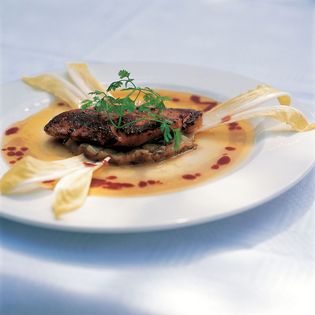 Pan-fried duck foie gras with honey-braised endives and mead jus