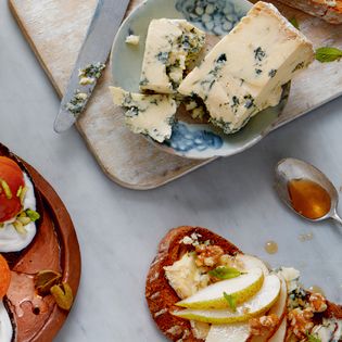 Stichelton, vanilla and acacia honey-glazed walnuts, mint and pear