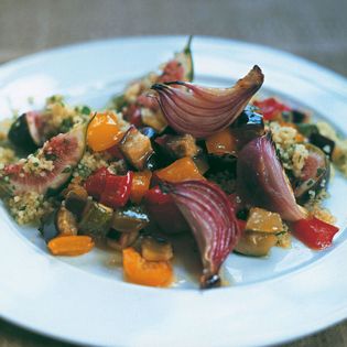 Honey-roasted vegetables with cumin and fig couscous and olive sauce