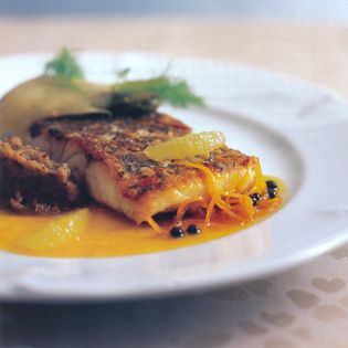 Barramundi with Smoky Eggplant Purée, Confit Fennel & a Citrus Sauce