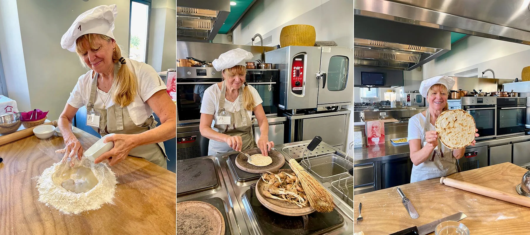 Marietta was more than Artusi’s loyal servant, he credited her with being his teacher and collaborator and they shared many hours in the kitchen together. In the introduction to her panettone recipe. He says: “My Marietta is a good cook, and such a good-hearted, honest woman that she deserves to have this cake named after her, especially since she taught me how to make it.” At Casa Artusi, La Associazione delle Mariette is a team of local volunteers who teach cooking school guests to make Piadina Romagnola (the local flatbread) and egg-rich pastas.