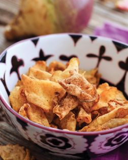 In a medium bowl, combine the olive oil, chile powder, garlic powder, and a large pinch of salt. Add the rutabaga chips, turning by hand to make sure they ar