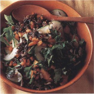 To me, rice salads often seem very dull. But wild rice – which isn’t really rice but a type of grass – has nutty-flavoured, chewy-textured black grains which make it perfect for eating cold. Adding the dressing while the rice is hot means that the rice absorbs the flavours and moisture of the dressing much more effectively. This is an easy salad for a party as it can be prepared in advance.