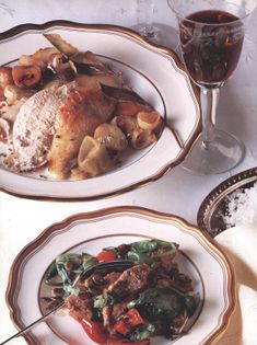 Set the oven to preheat at Gas Mark 6/200°C/400°F. Put the slices of leek on the bottom of a large, deep roasting pan. Arrange the potato slices among the leeks, sprinkle with salt and pepper and lay the bay leaf branches between them in a central layer. Dribble the olive oil and sherr