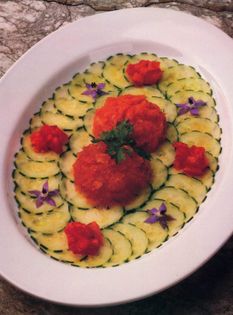 Peel the cucumber, score lengthwise with a fork, and cut into 1/16-inch-thick slices. Whisk salt and pepper into