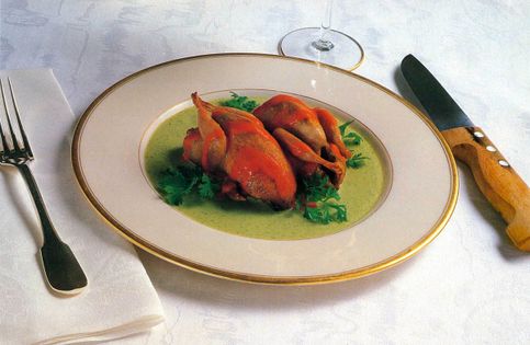 This dish is inspired by the books of Diana Kennedy, as well as by her wonderful cooking. Her mole verde de pepita appears in The Cuisines of Mexico. This pumpkinseed sauce does not sound like much, but the flavors from the seeds are deep, complex, and very intriguing. Yet they do not overpower the delicate flavors of the quail.
