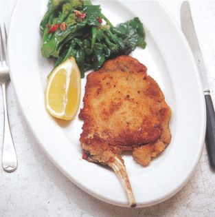 “Meat cooked the Milanese way is almost always breaded and fried. The most typical example is usually made with veal, but the dish is also possible with chicken or pork. For this one here, you need a large pork cutlet with the bone, the flesh beaten quite thinly. The rest is child’s play.”