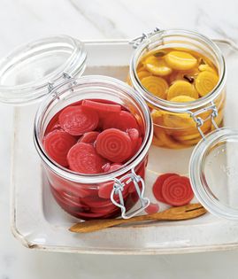 Pickled beets charm in salad preparations, lending color, texture, and their signature flavor. Try them layered with fresh mozzarella and a drizzle of olive oil, or eat them straight from the jar. Any beet variety, from red to gold to red-and-white-striped Chioggias, can be used.