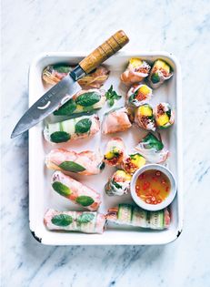 You can have a lot of fun with these colourful, ultra-healthy spring rolls. Any vegetables can be used, so let the left side of your brain take control. After a few tries you will get the hang of rolling, but I have a few tips to make it easier: err on the side of not soaking the wrappers for too long, don’t overfill the rolls and keep the tension up when rolling so they are tight.