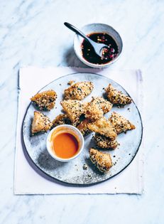 Remove the crusts from the bread and cut each slice into three triangles. Spread the mixture thickly over the bread slices. Dip each one in the sesame seeds.