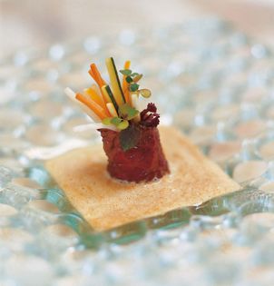 The best quality kobe or wagyu beef, lightly marbled with fat, is highly prized by the Japanese for its melt-in-the-mouth tenderness. A little goes a long way in this dish, where the meat’s inherent richness contrasts nicely with the crispness of vegetables and the zen-like purity of a soy-based sauce.
