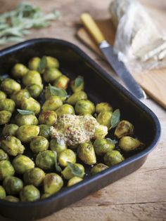 Put the sprouts in a baking dish and toss in just enough olive oil to coat. Season with salt and pepper and