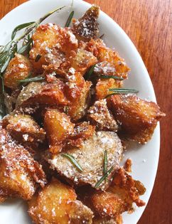 One of my customers asked me if we added crack to these potatoes—he found them addictive. So do many other folks. To be truthful, there is really nothing special about them; they are just good organic russets, cooked gently with garlic and rosemary and fried. Then they’re tossed with pecorino, which adds umami, salt, and fried rosemary leaves. That is it. In any case, if you find them addictive, I warned you!