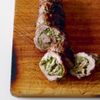 Season the fillets, fill them with pistachio pesto, roll them back up to enclose the filling. Tie them up with cooking twine soake