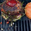 Slice the onion. Cook the hamburger patties, onion and the bacon over high heat. Toast the buns on the barbecue.