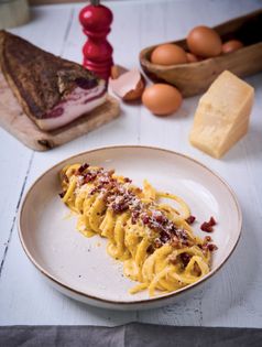 So simple at first glance and yet so intricate, carbonara is more of a ritual than a dish. The twist here is gently cooking the eggs and cheese on a double boiler before combining them with the pasta, giving you a smooth sauce every time, with no raw or scrambled eggs in sight.