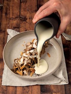 Tagliatelle or tagliolini ai funghi is such a classic of Italian cuisine. It features in many regions of the Italian peninsula and I love it - I just love mushrooms! To twist it and create something new, I’ve incorporated porcini mushroom powder directly into the pasta dough and paired it with a rich cheese sauce. The woody notes of coffee and almonds elevate this well rounded, hearty dish into a classy pasta for adventurous connoisseurs.