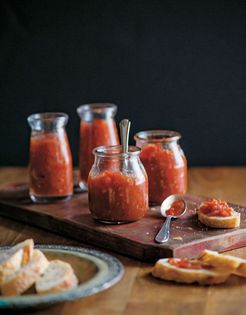 Appreciating tomatoes as both fruits and vegetables opens up our minds to the endless possibilities of cooking with them. When tomatoes are plentiful, we add their sweet fruitiness to our repertoire of jams and preserves. Delicately spiced with warm, earthy flavors, this red tomato jam is a welcome change from our berry jams. A generous swipe of tomato jam on warm toast with a fragrant cup of coffee remind us how great a simple summer-morning breakfast can be.