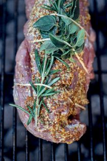 Smear the beef fillet with the wholegrain mustard and tie with water-soaked cotton string. Thread sprigs of rosemary and other herbs through the string. Sear the beef fillet over a very warm direct fire and season with coarse salt and freshly ground black pepper. Scatter the beef fillet with balsamic vinegar. Return to a medium heat until cooked.