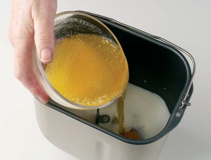 Pour the milk into the bread machine pan. Add the egg(s) and melted butter. If the instructions for your machine specify that the yeast is to be placed in first, reverse the order in which you add the liquid and the dry ingredients.