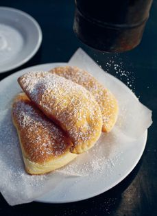 I can’t re-create the atmosphere at Café du Monde, a more-than-a-century-old, open-air coffee shop in New Orleans’ French Quarter, but I was inspired by their signature beignets to make my own at Brown Sugar Kitchen. I use a lighter vegetable oil to fry them and a little less powdered sugar than they do at the Café. The chocolate-chicory sauce is my own spin on Café du Monde’s signature coffee drink. These are at their best served warm.
