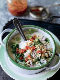 At morning markets in Shan areas of Burma and northern Thailand, there is always at least one vendor selling this thick, smooth, pale yellow soup for breakfast, hot and enticing, often poured over fine rice vermicelli. Alongside they sell Shan tofu, either in large chunks to take home or cut up and dressed as a salad (see Shan Tofu Salad).